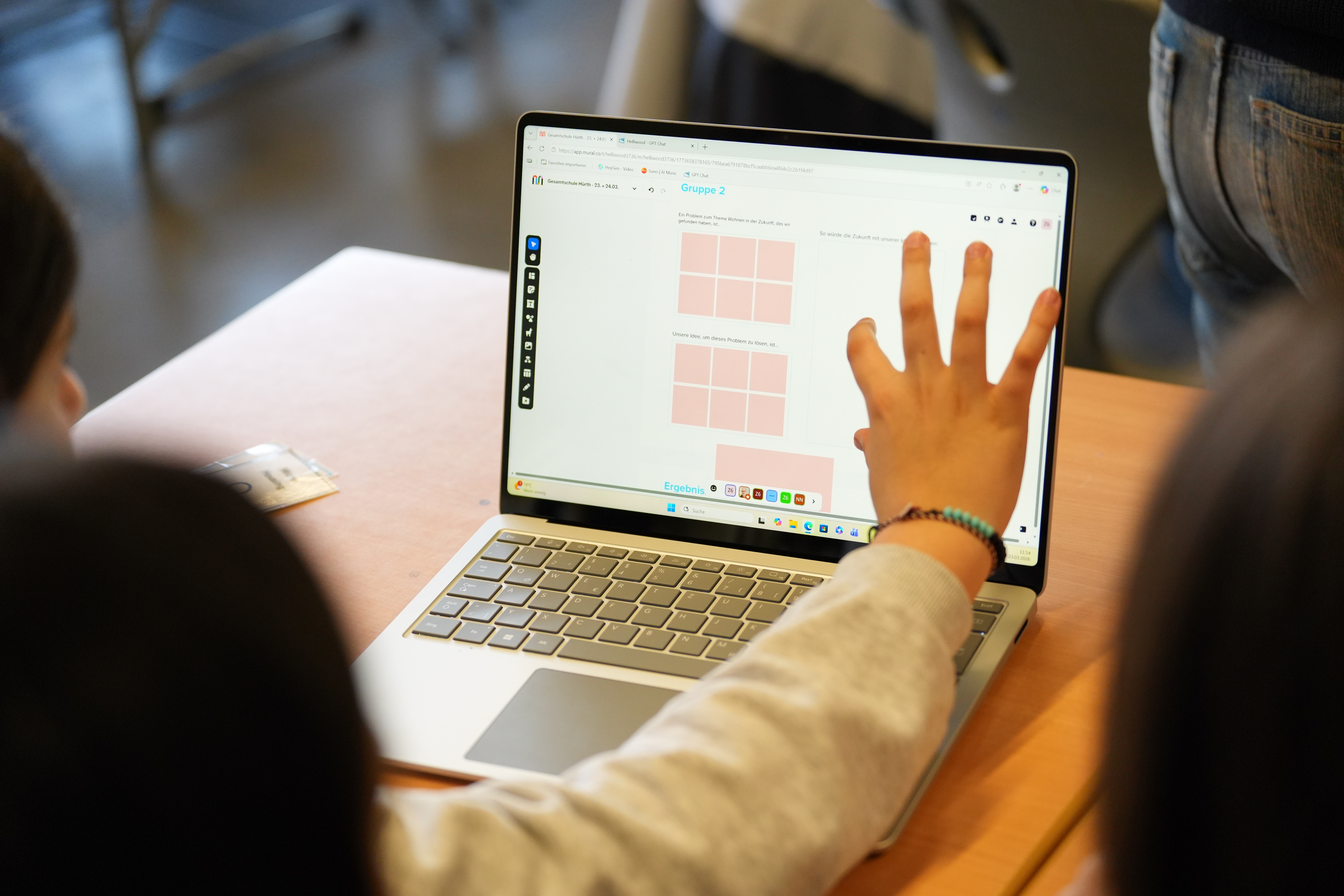 Am ersten Workshoptag setzen sich die Schülerinnen und Schüler mit Zukunftsthemen auseinander und benennen Herausforderungen, etwa in den Bereichen Wohnen oder Mobilität, denen sie in ihrer eigenen Lebensrealität begegnen. In Kleingruppen wählen sie einen Zukunftstrend aus und recherchieren dazu mit Unterstützung von Künstlicher Intelligenz. Durch den Austausch mit der KI und untereinander vertiefen sie ihr Wissen und beginnen, eigene Medienprojekte als Antwort auf ein selbst gewähltes Problem zu planen.